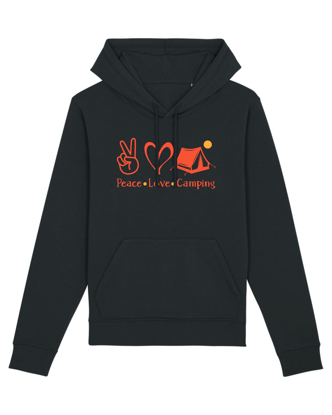 Hanorac unisex, model color, cu mesaj "Peace Love Camping", ideal pentru pasionatii de drumetie, camping sau alte activitati outdoor.