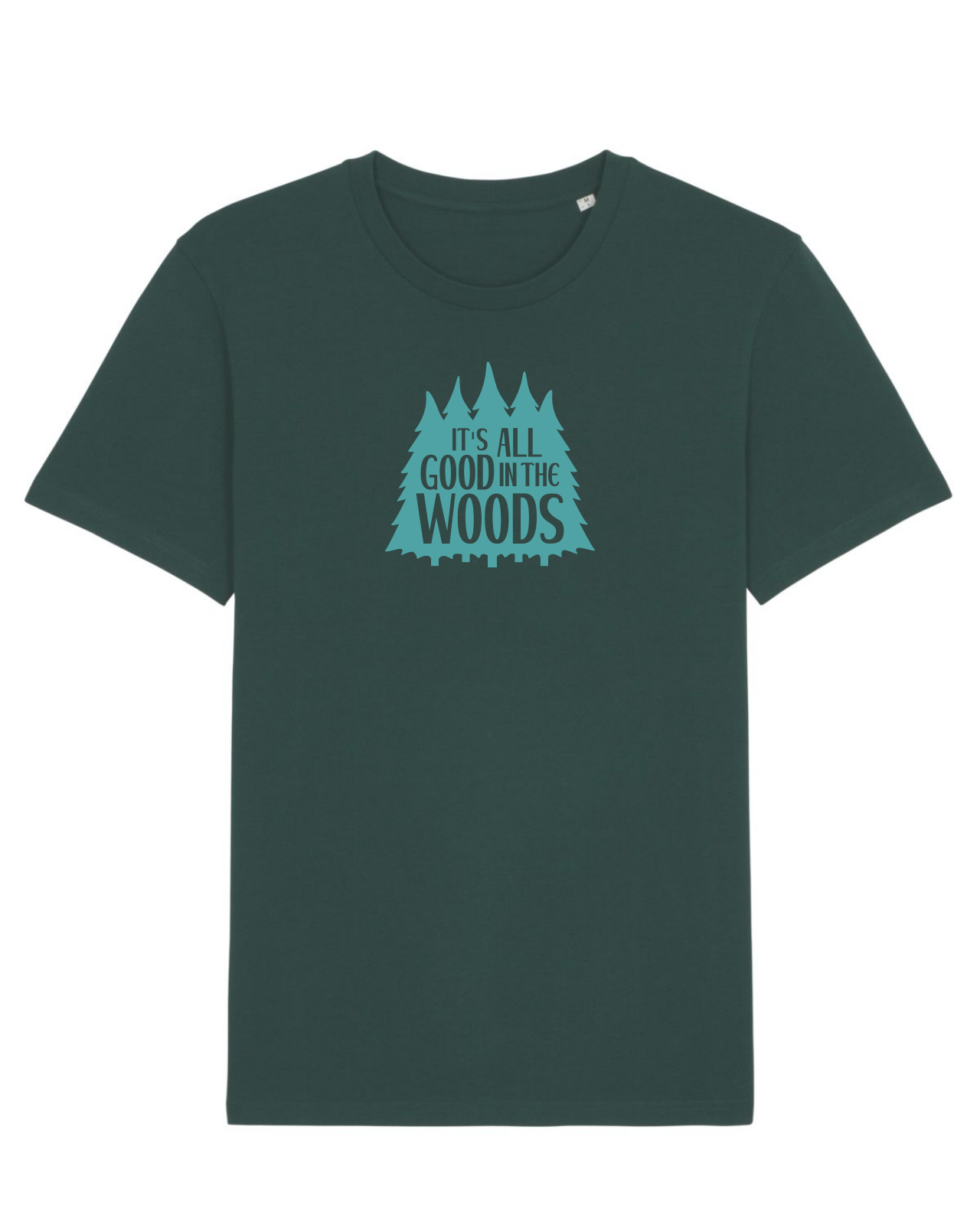 Tricou unisex/barbati, model color, mesaj "It's all good in the woods", ideal pentru pasionatii de drumetie, camping sau alte activitati outdoor.