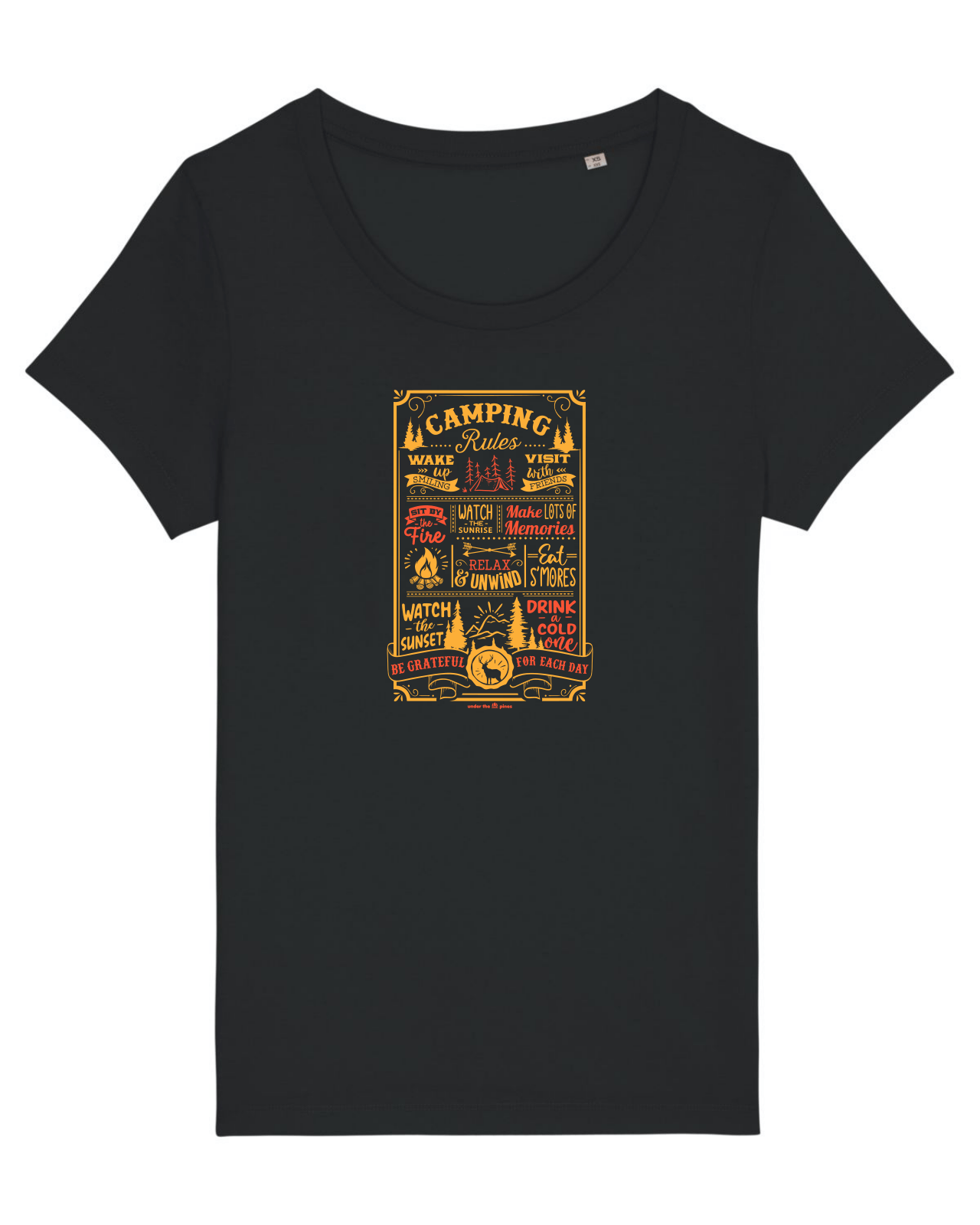 Tricou unisex/barbati, model color, mesaj "Camping Rules", ideal pentru pasionatii de drumetie, camping sau alte activitati outdoor.