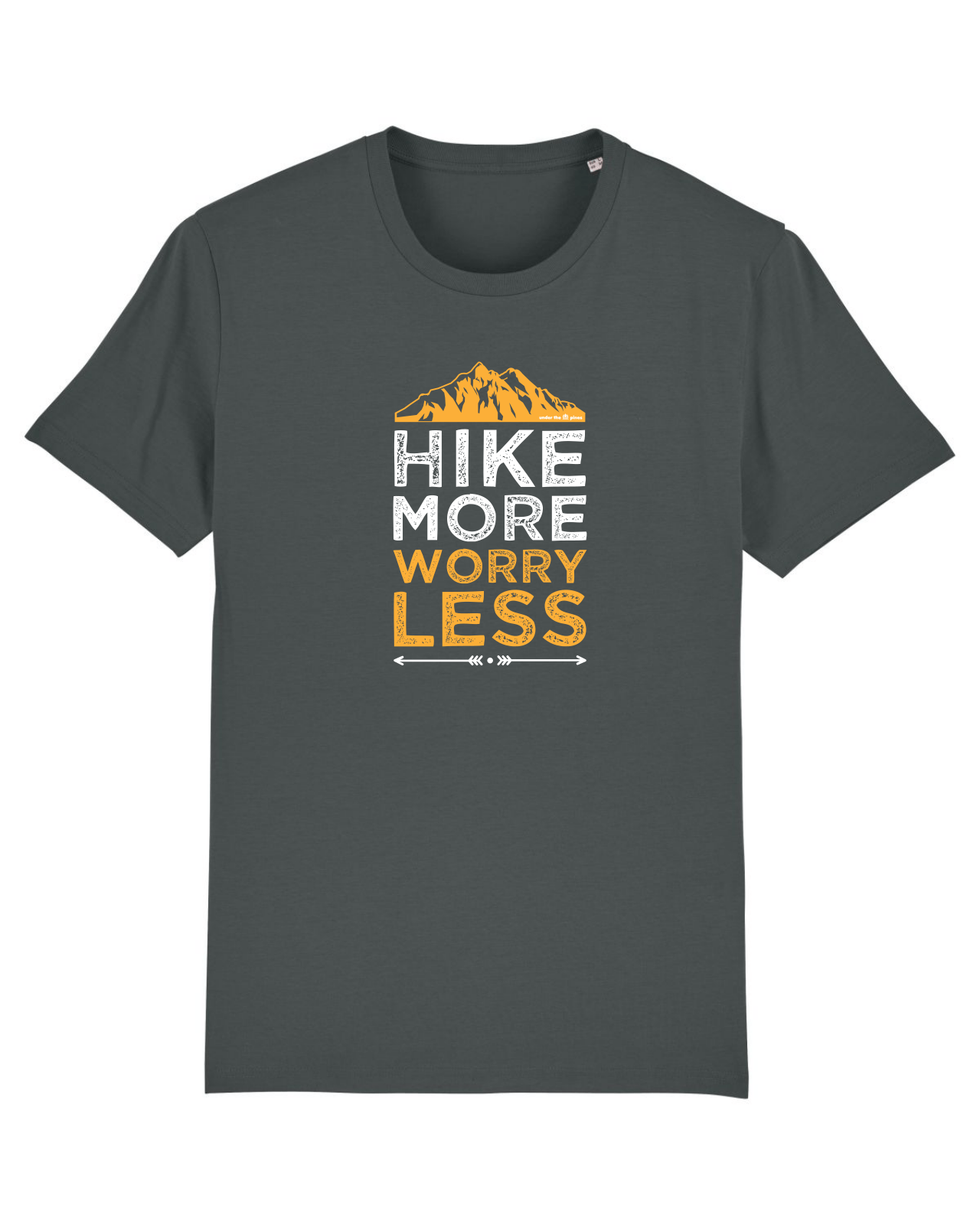 Tricou unisex/barbati, model color, mesaj "Hike More Worry Less", ideal pentru pasionatii de drumetie, camping sau alte activitati outdoor.