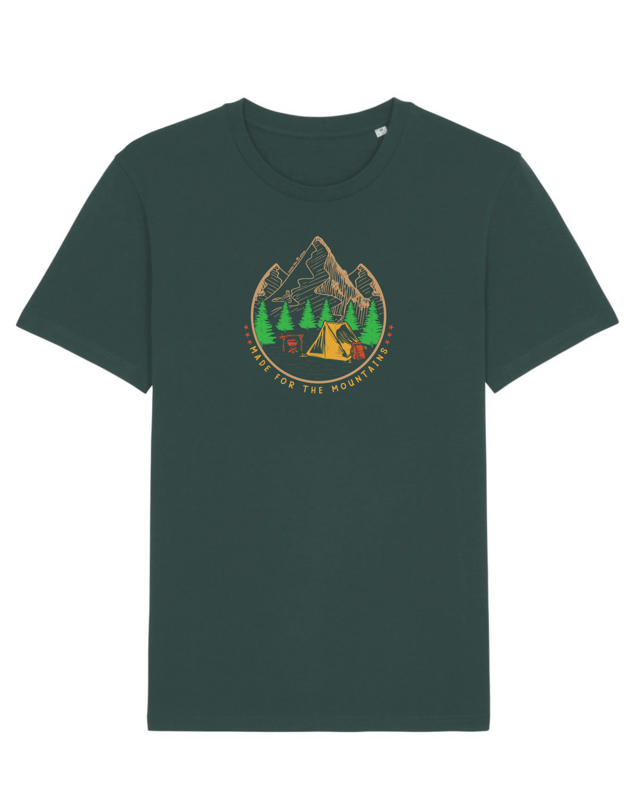 Tricou unisex/barbati, model color, mesaj "Made for the Mountains", ideal pentru pasionatii de drumetie, camping sau alte activitati outdoor.