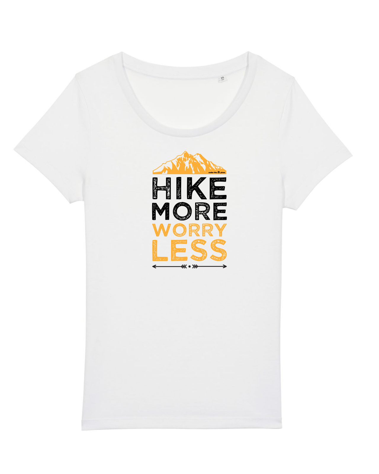 Tricou femei, model color, mesaj "Hike More Worry Less", ideal pentru pasionatele de drumetii, camping sau alte activitati outdoor.