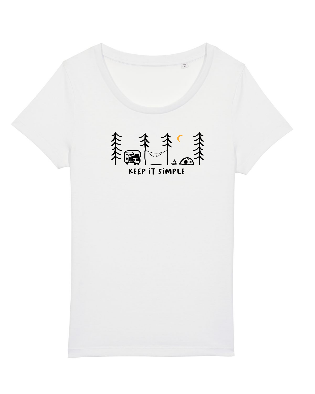 Tricou femei, model color, mesaj "Keep it simple (camping life)", ideal pentru pasionatele de drumetie, camping sau alte activitati outdoor.