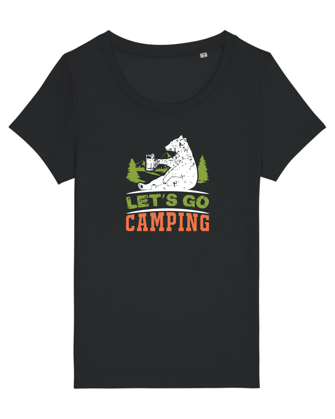 Tricou femei, model color, mesaj "Let's go camping", ideal pentru pasionatele de drumetie, camping sau alte activitati outdoor.