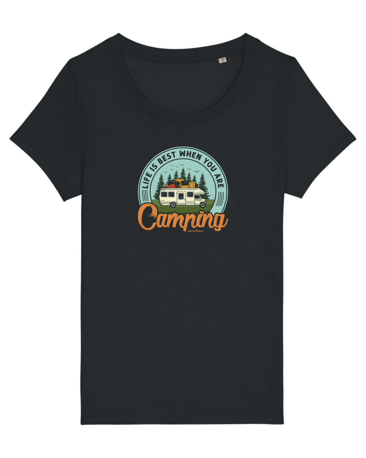Tricou femei, model color, mesaj "Life is Best When You Are Camping", ideal pentru pasionatele de drumetie, camping sau alte activitati outdoor.