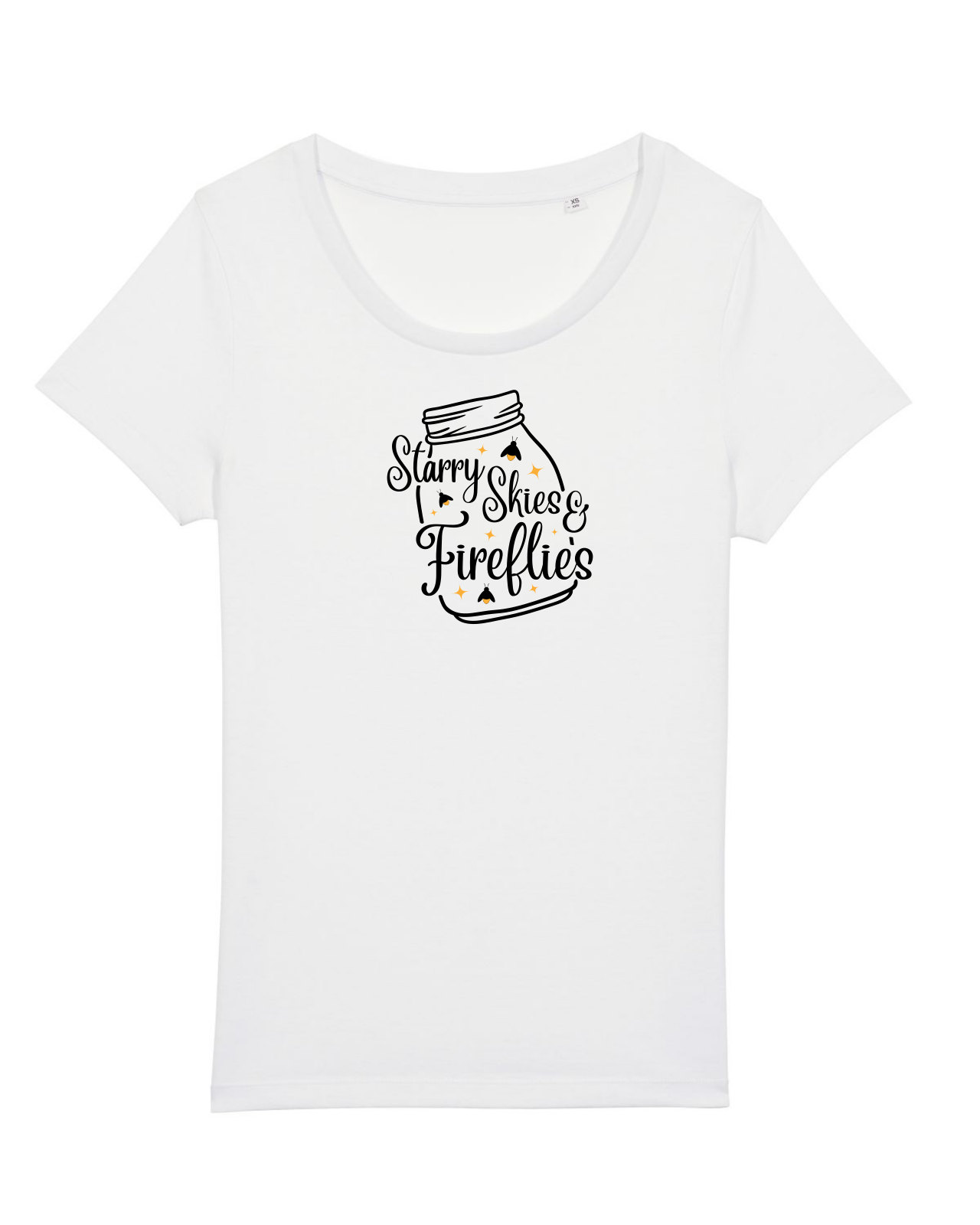 Tricou femei, model color, mesaj "Starry Skies & Fireflies", ideal pentru pasionatele de drumetie, camping sau alte activitati outdoor.